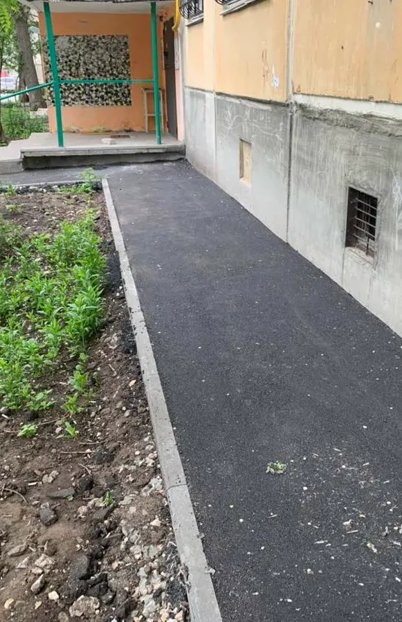 Замена асфальтобетонного покрытия на придомовой территории, пешеходных дорожках и проезжей части. Ямочный ремонт.